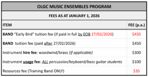 The schedule of fees for OLGC Band participants for 2026 are set out below: