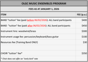 The schedule of fees for OLGC Band participants for 2026 are set out below: