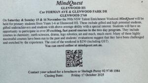 High potential and gifted students are invited to enrol in the 99th MindQuest program which will be held on Saturday and Sunday at Glenwood High School on 15 & 16 November 2025. To enrol please see below: